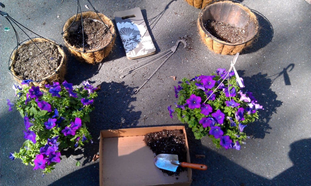 I didn’t have to be into work until later in the morning, so I said good-bye to Matt and went home to play with Griff. The I decided to play musical chairs with some of my existing pots and some new petunias my husband picked up for my special day.